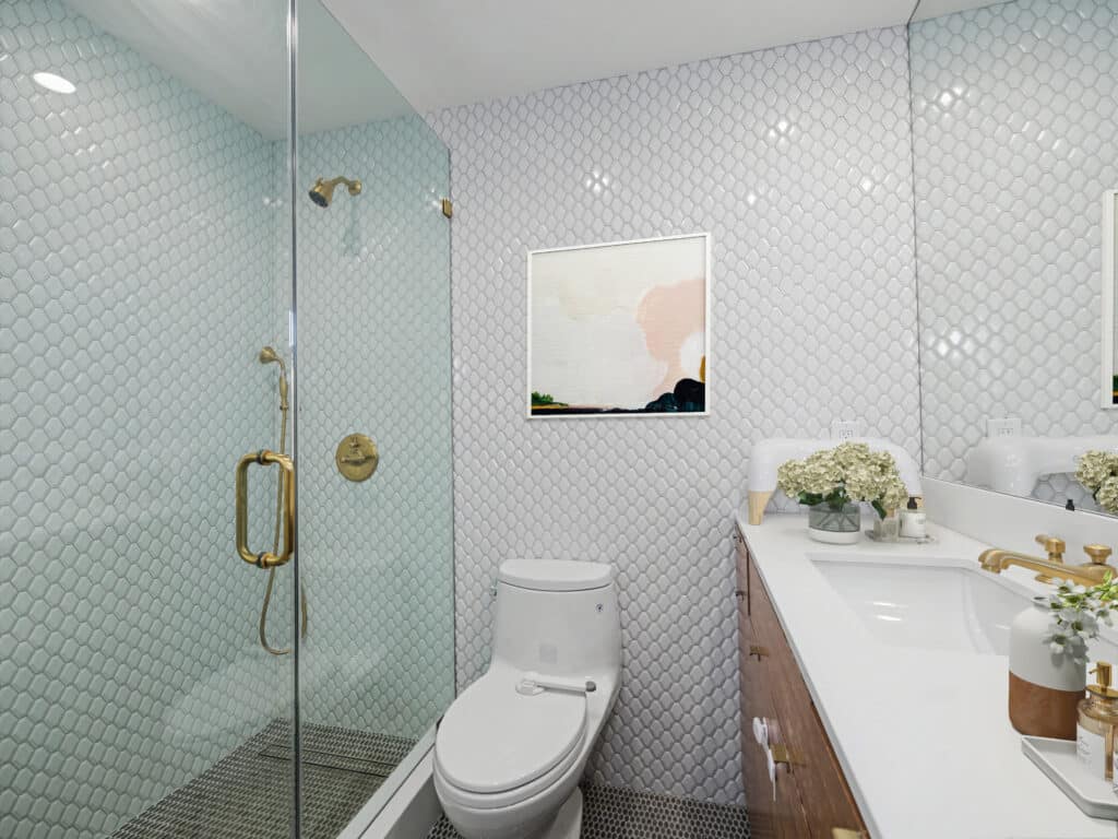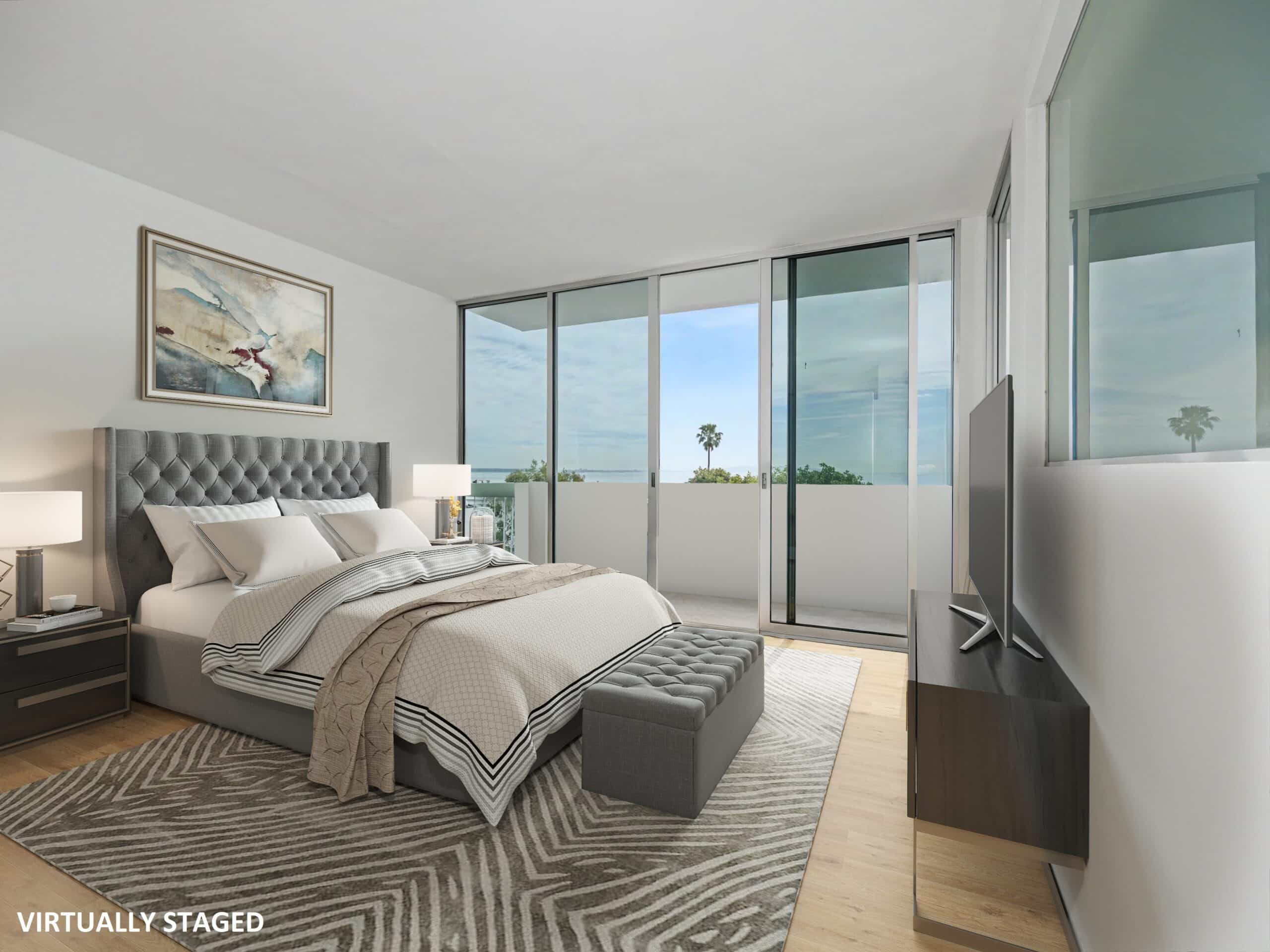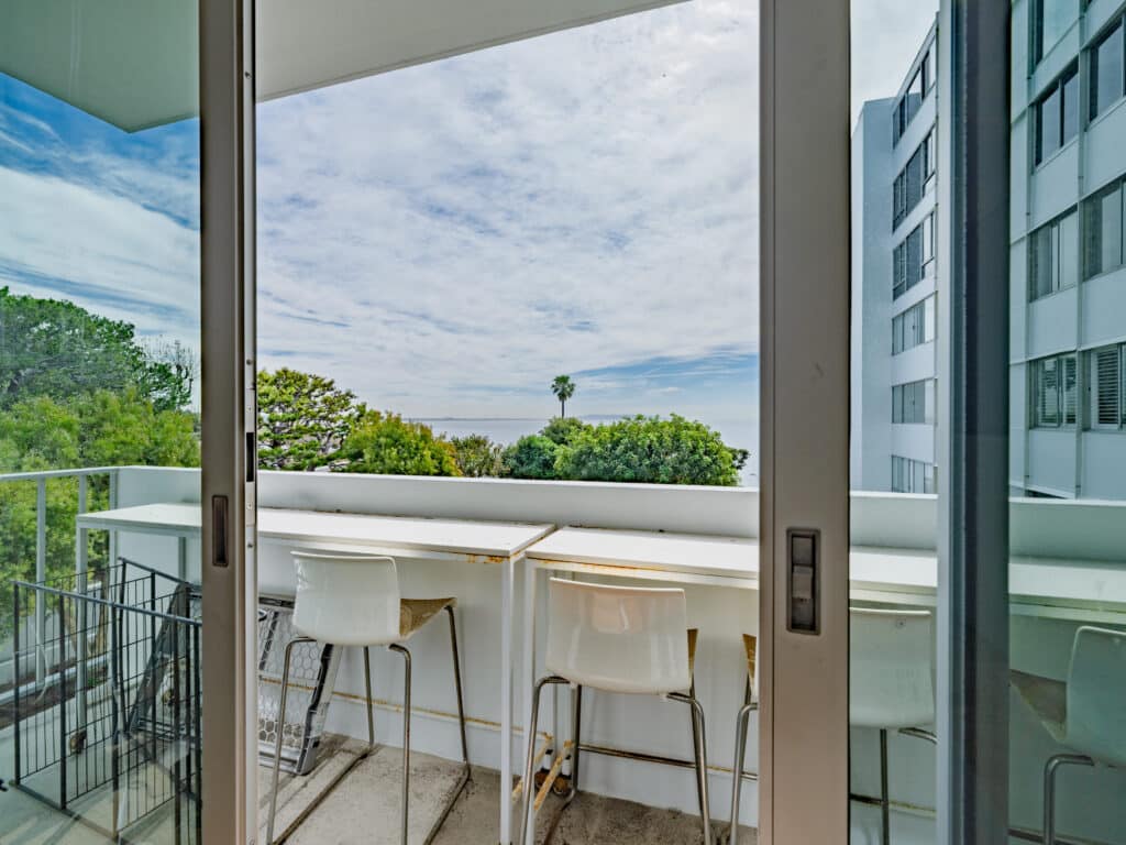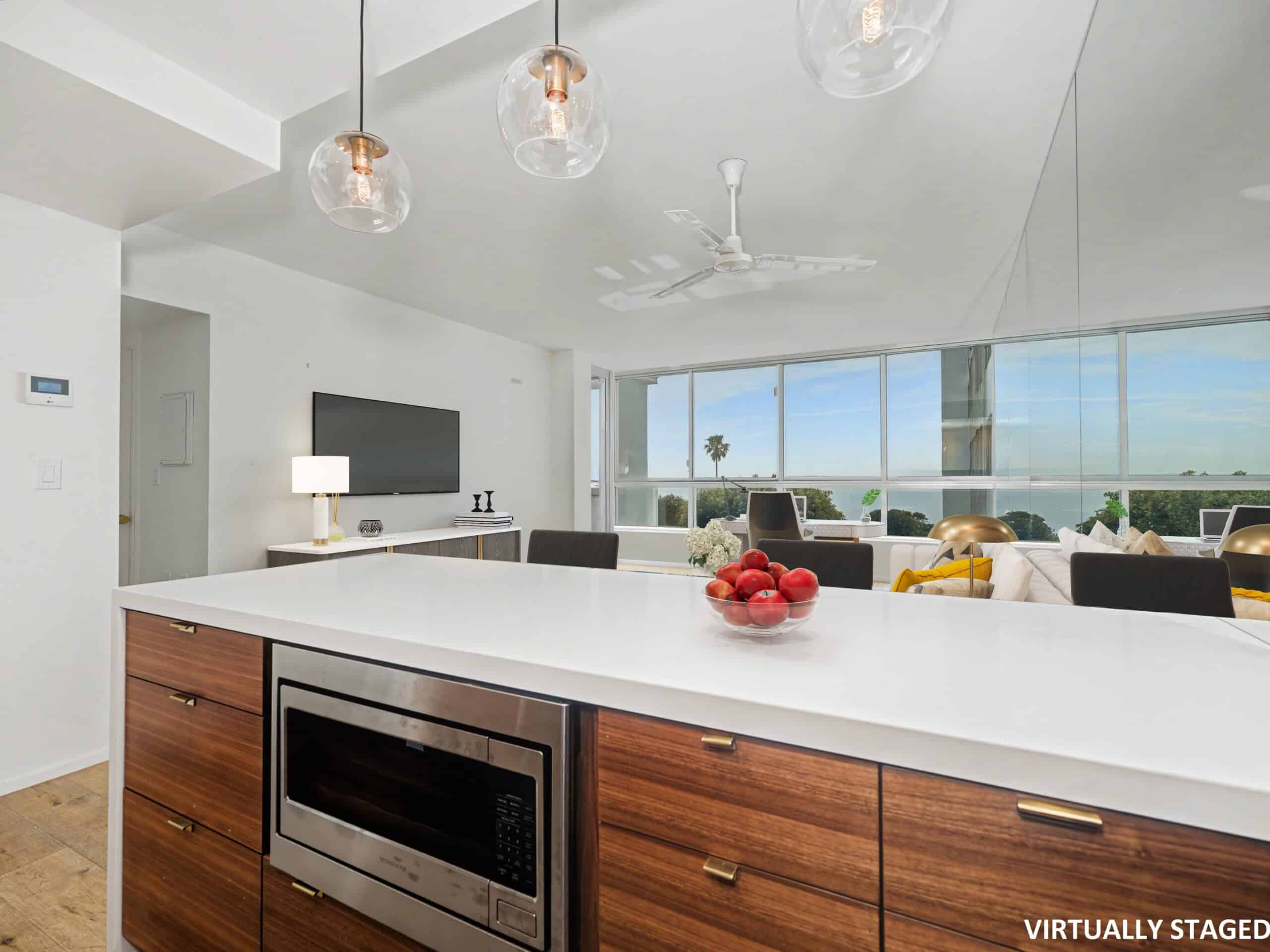 The stylish kitchen features sleek cabinetry, stainless steel appliances, and a spacious island perfect for entertaining. The living area flows seamlessly toward floor-to-ceiling windows that frame breathtaking ocean and coastline views. The bedroom offers direct views of the Pacific and generous closet space, while the bathroom showcases elegant tilework and contemporary fixtures.