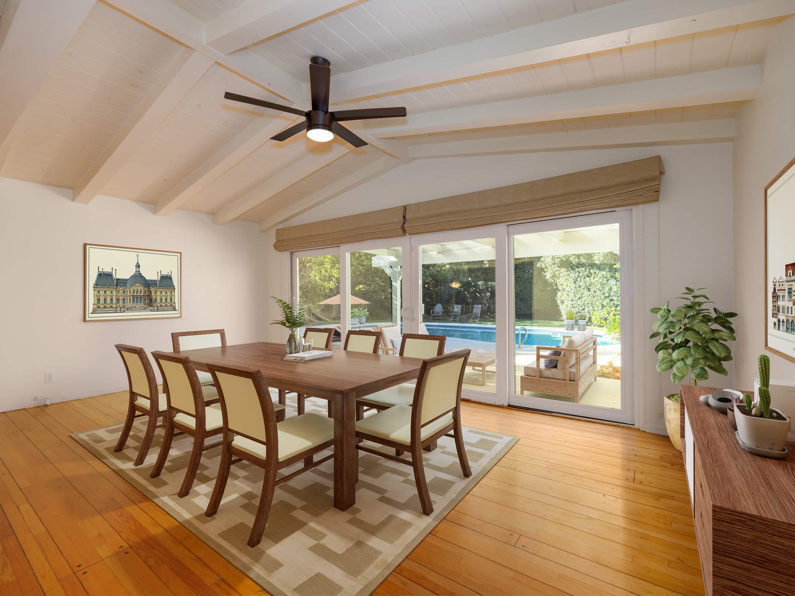 Outdoors, the property feels like a private oasis, featuring a covered patio, lounging areas, and a sparkling pool surrounded by lush greenery, perfect for relaxing, entertaining, or enjoying Southern California’s year-round sunshine.
